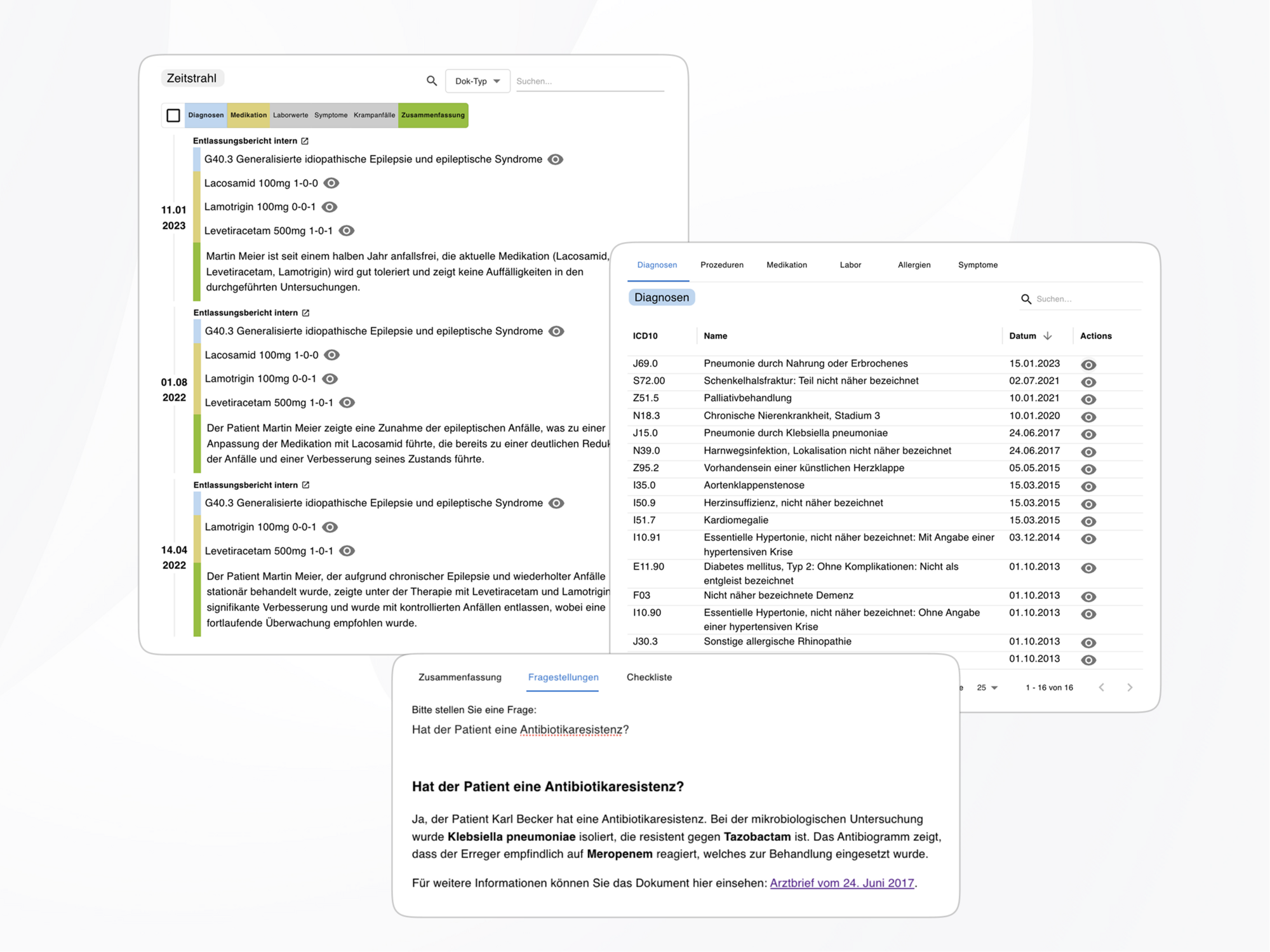 Hochwertige, vollständige und klar strukturierte Arztbriefe erstellen – ganz automatisch. Die Arztbriefschreibung analysiert und vereint automatisch sämtliche medizinische Unterlagen, die zu einem Patienten vorliegen – Befunde, OP-Berichte, Diagnosen, Pflege- und Therapiedokumentationen. Ein KI-Bewertungsmodell prüft alles auf medizinische Korrektheit, Konsistenz und Vollständigkeit. Unklare oder unsichere Informationen werden deutlich gekennzeichnet.